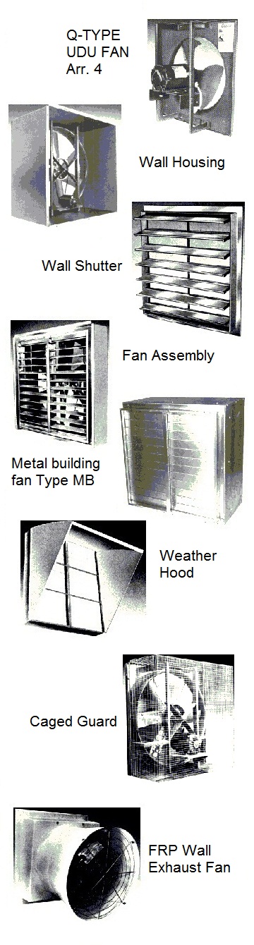 Wall fan accessories: wall housing, wall cabinet, heavy gauge housing, extended wall housing, wall housing access door, inlet guard, outlet guard, caged guard, fixed louver, shutter, manual shutter with pull chain and quadrant lock, gravity automatic shutter, motorized shutter, back draft damper, shutter motor, BELIMO motor, NEP motor, Multiproducts motor, Delay switch, Speed controller, VFD, intake hood, discharge hood, weather hood, hood bird guard, hood bird screen, insect screen.